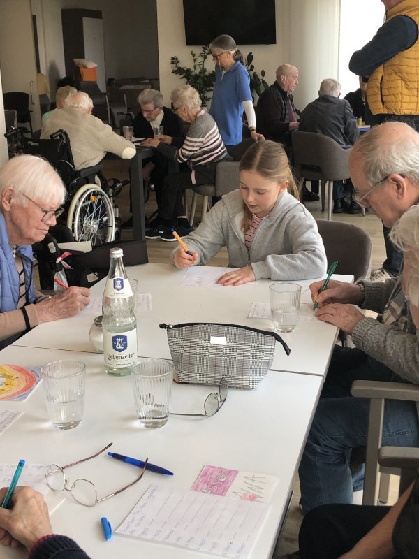 Im Rahmen Ihres Sozialpraktikums haben zwei Schülerinnen der Luise-Büchner-Schule mit einer Ganztagsgruppe ältere Menschen im „Martin-Haug-Stift“ in der Tagespflege besucht. Zuvor haben unsere Ganztagskinder unter Anleitung der Praktikantinnen in einer AG wunderschöne Postkarten hergestellt. Diese wurden am 6. März den älteren Menschen übergeben. Darüber hinaus wurden generationsübergreifende Spiele gespielt und es fanden interessante und erheiternde Gespräche zwischen Jung und Alt statt.