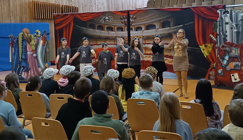 Gespannt wurde den beiden professionellen Sängerinnen gelauscht und erlebt, wie die Souffleuse Aida gemeinsam mit ihrem eigentlich verhassten Kollegen Papageno versuchte, deren geliebtes Opernhaus vor der Schließung zu retten. Gemeinsam begaben sich die beiden auf eine abenteuerliche Suche hinter die Kulissen der Oper, um den magischen Zaubertrank zu brauen. Dieser sollte die Geschichte der Oper zum Guten lenken. Dabei stellten sich den beiden vielen Abenteuern, in denen auch je zwei Schüler aus jeder Klasse als Piraten oder wilde Tiere mitwirkten. Immer wieder schlüpften die beiden Darstellerinnen in die Rollen berühmter Operngestalten. Dabei bekamen die jungen Zuhörer einen Einblick in die fabelhafte und vielfältige Welt der Opern. Sie lauschten beeindruckt den Stimmen der Profis, die „live“ für die Kinder sangen.