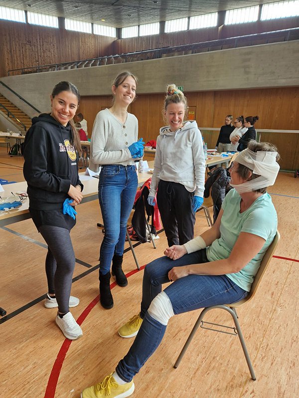 Am Freitag absolvierten die Lehrpersonen einen Erste-Hilfe-Kurs unter der Leitung von Lena Correus vom Deutschen Roten Kreuz. Durch die Beschäftigung mit Fallbeispielen aus dem Schulalltag lernten sie, wie Kindern in kleinen und großen Notfällen geholfen werden kann. Der Kurs zeichnete sich durch Lebendigkeit und Praxisnähe aus. Von dem kindgerechten Binden von Verbänden über das Entfernen von Zecken bis zum Üben der lebensrettenden Maßnahmen am Kind konnten viele Erste-Hilfe-Maßnahmen gezielt trainiert werden.