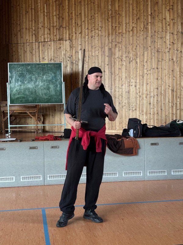 Freudenstadt – Eine kleine Zeitreise unternahmen die dritten Klassen der Theodor-Gerhart-Schule, als Ingo Litschka von der Fecht-Hut Schule für historische Kampfkunst aus Pforzheim zu Besuch kam. Ehrenamtlich nahm er sich zwei Stunden Zeit, um den Schülerinnen und Schülern einen lebendigen Einblick in das mittelalterliche Fechten zu geben.