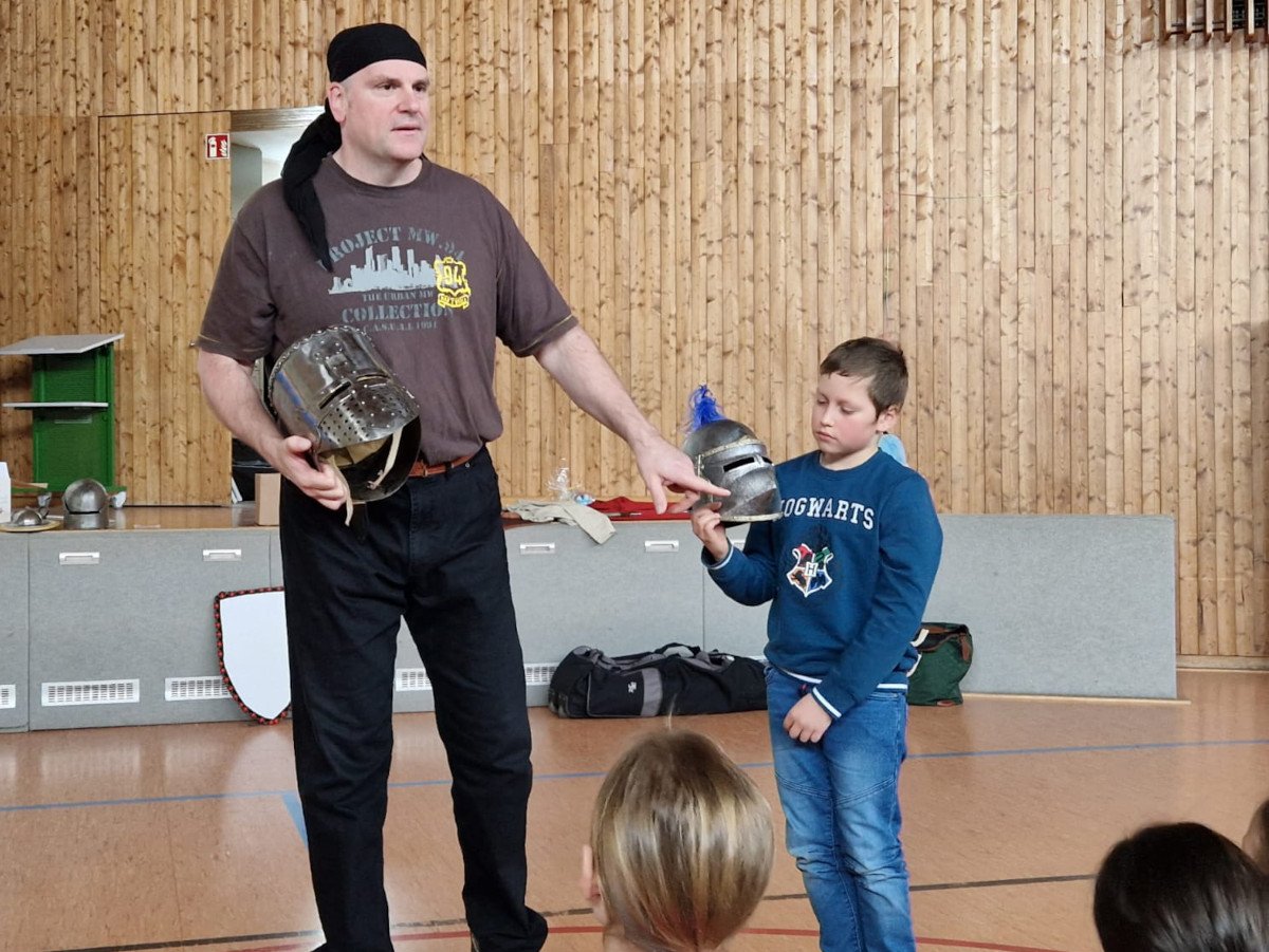 Die Schüler:innen der Klassenstufe 3 durften das Thema Mittelalter im Sachunterricht handlungsorientiert erleben. Herr Ingo Litschka von der historischen Fechtschule ,Fechthut' gestaltete in der Schulaula einen interessanten Workshop. Initiiert wurde die Kooperation von der Lehrerin Melanie Kistner.